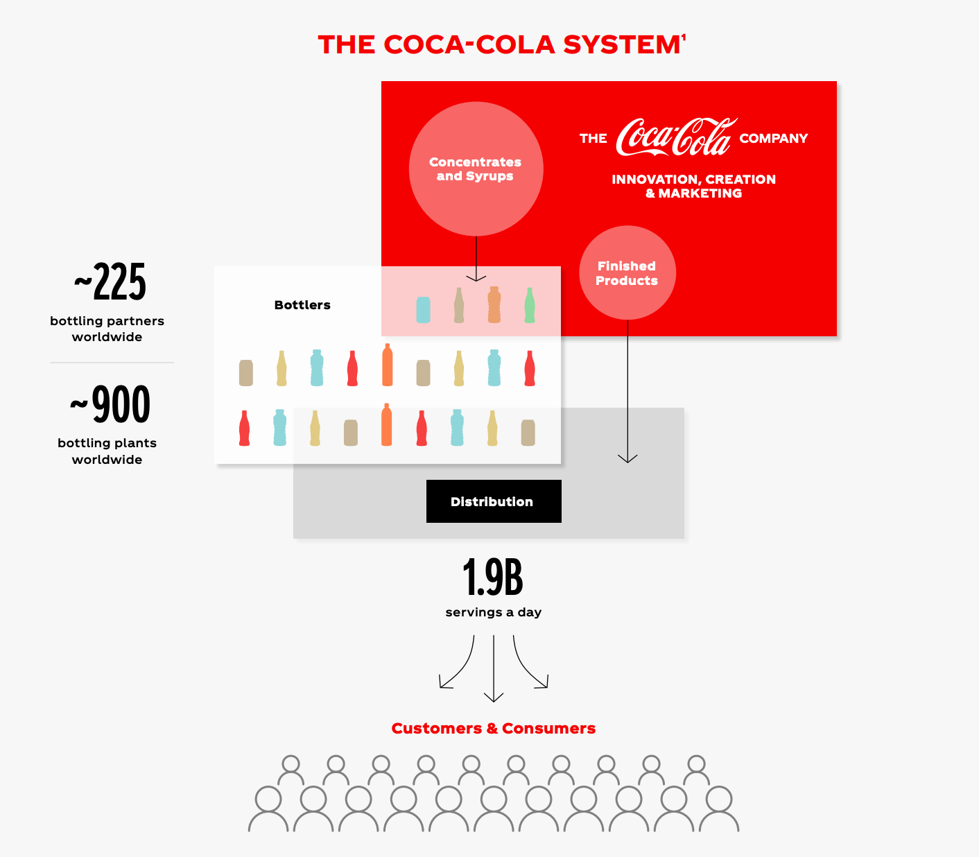 코카콜라의 인기가 꾸준히 상승하는 것을 보고, 사업자 '조셉 비덴한'은 원액을 대량으로 사들이는 조건으로 자신이 살고 있던 미시시피 주 내에서 독점적인 판매권을 달라고 코카콜라에게 제안합니다. 캔들러는 이를 받아들였고, 체계화하여 '보틀링 시스템'을 고안하게 되는데요. 보틀링 시스템이란 지역별로 보틀러(병 제조업자)와의 계약을 통해 지역 내에 독점 판매권을 부여하는 것으로, 코카콜라 컴퍼니로부터 대량의 원액을 납품받아 각자가 제조한 병에 넣어 판매할 수 있도록 하는 방식입니다. 코카콜라 입장에서는 원액만 제조하면 되기 때문에 비용 및 관리 측면에서 효율적이었죠.