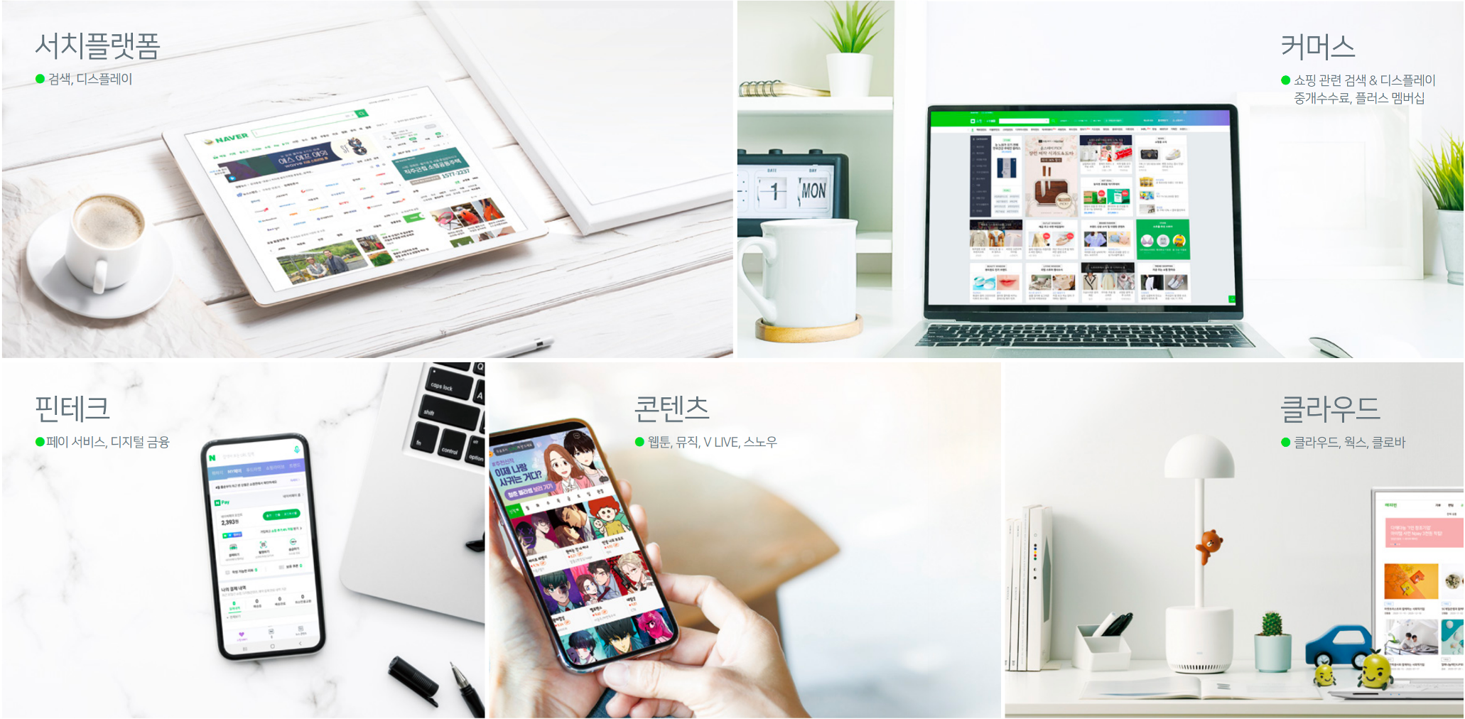 그리고 네이버의 자체적인 사업은 크게 5가지로 나눌 수 있습니다. 2020년 연간 매출 점유율 순서대로 서치플랫폼(52.8%), 커머스(20.5%), 핀테크(12.8%), 콘텐츠(8.7%), 클라우드(5.7%)인데요. 하나씩 간단하게 살펴보겠습니다.