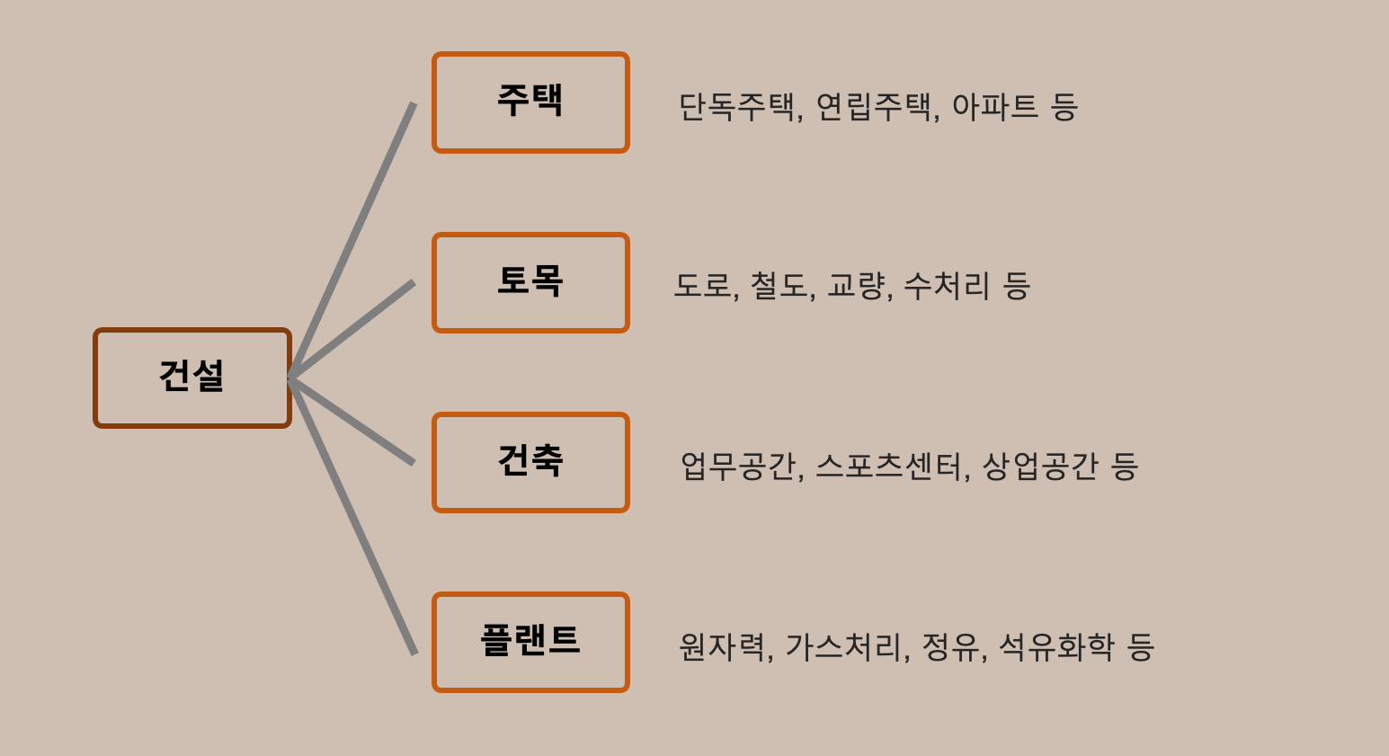 건설산업은 다양한 기준에 따라 분류될 수 있는데요. 가장 대표적인 기준으로는 발주처와 공정 종류가 있습니다. 우선 발주처 기준으로 건설 사업은 크게 민간 분야와 공공 분야로 나뉩니다. 공공 발주는 자치단체 및 공공기관이 발주하는 사업으로, 수익성이 낮은 대신 수익을 정산받지 못하는 위험에 대한 리스크가 낮다는 특징이 있습니다. 반대로 민간 발주는 제대로 정산을 받지 못할 수 있다는 리스크가 있는데, 대신 기대수익률은 높은 편이죠. 그리고 공정 종류에 따라서는 크게 주택(단독주택, 아파트 등), 토목(도로, 철도, 교량 등), 건축(업무공간, 상업공간, 의료시설 등), 플랜트(오일, 가스처리, 정유 및 석유화학 시설 등)로 나뉠 수 있습니다.