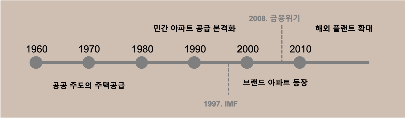 국내 건설 산업의 역사는 1960년대로 거슬러 올라갑니다. 당시 우리나라의 연간 출생자 수는 약 100만 명에 달했고, 인구에 비해 토지가 부족해서 아파트 중심의 주택이 공급되기 시작됐는데요. 주공(LH공사), 시영(SH공사) 아파트와 같은 공공 주도 건설업이 이 시기에 생겨난 것입니다. 그리고 1980년대부터는 민간 중심의 아파트 건설이 본격화되었습니다. 대표적으로 삼익, 삼부, 청구, 한신, 동아, 한양아파트 등이 있습니다.