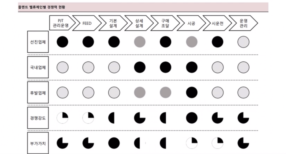 하지만 어느 정도 경쟁력이 있다고 안심할 수는 없는 상황입니다. EPC 사업은 건설 밸류체인 중에서 상대적으로 부가가치가 낮고 경쟁강도가 높은 편입니다. 실제로 터키와 중국의 후발 업체들이 점차 EPC 사업에 진출하고 있죠. 국내 건설업체는 후발 업체와의 기술력 차이를 벌리고 더 높은 부가가치를 창출하기 위해, 역량 확장에 노력을 기울이고 있습니다. 특히 선진업체가 강점을 가진 기본 설계 시장에 활발하게 진출하고 있다고 합니다.
