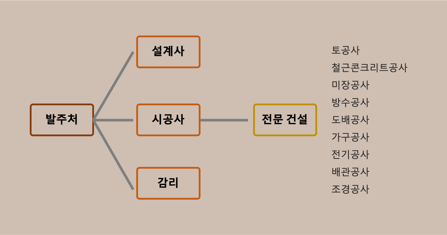 건설산업은 다양한 밸류체인을 갖고 있습니다. 건설 공정에 따라 프로젝트 관리 및 타당성 조사, 기본 설계(FEED), 상세 설계, 구매/조달, 공사/시공, 시운전, 유지/보수로 구성되어 있는데요. 한 기업에서 전부 운영하는 경우도 있으나, 일반적으로 설계사, 시공사, 감리*회사로 나뉘어 운영됩니다. 또한 도배, 전기, 배관, 방수 등 특수 분야의 전문 건설회사도 존재하는데, 이들은 보통 비상장사이며 시공사의 외주를 받아 사업을 진행하는 경우가 많습니다.