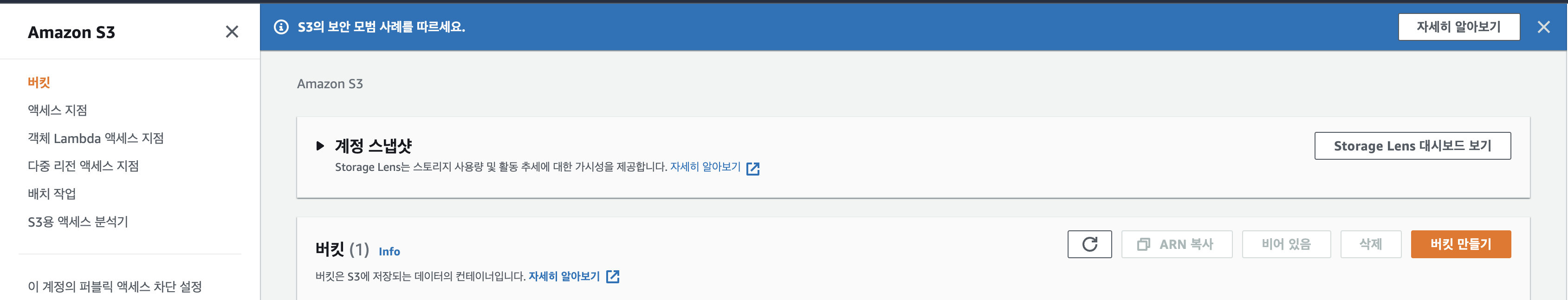 AWS 계정을 생성하고 S3를 검색하면, 버킷이라는 페이지를 볼 수 있을 것입니다.