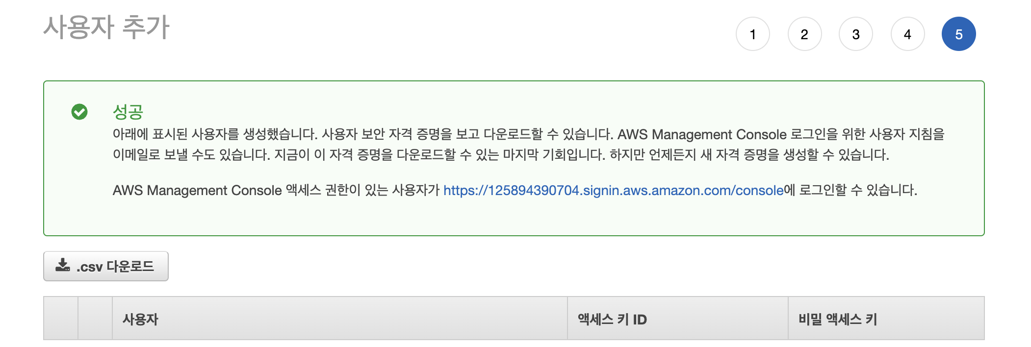 그리고 쭉쭉 넘겨서 생성을 완료하면 (다음과 같은 페이지 밑에) 사용자 이름과 액세스 키, 비밀 액세스 키가 뜨는 것을 확인하실 수 있습니다.