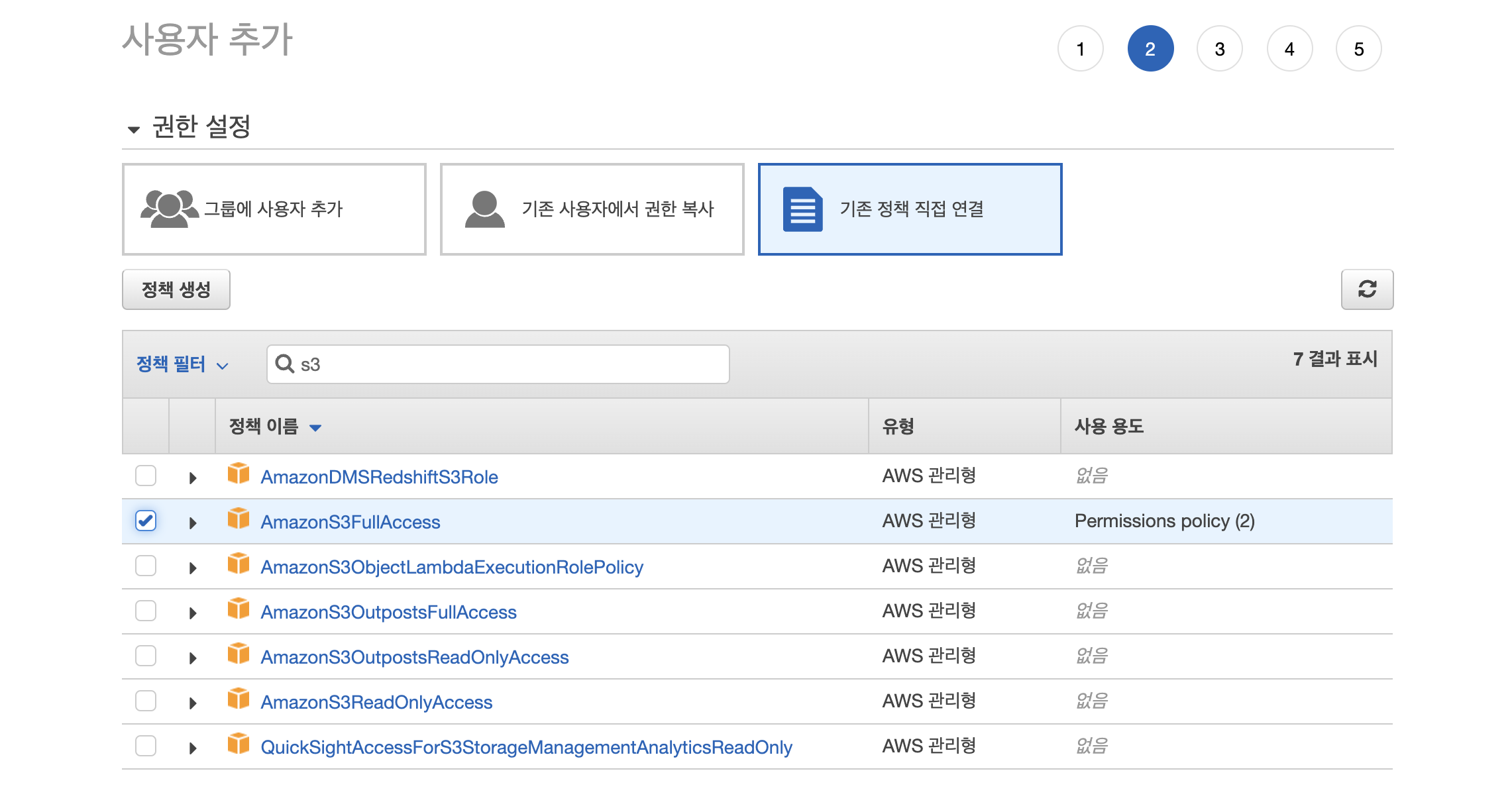 그리고 다음으로 가서 '기존 정책 직접 연결'을 누르고, s3로 정책을 필터하여 AmazonS3FullAccess를 선택해주세요.