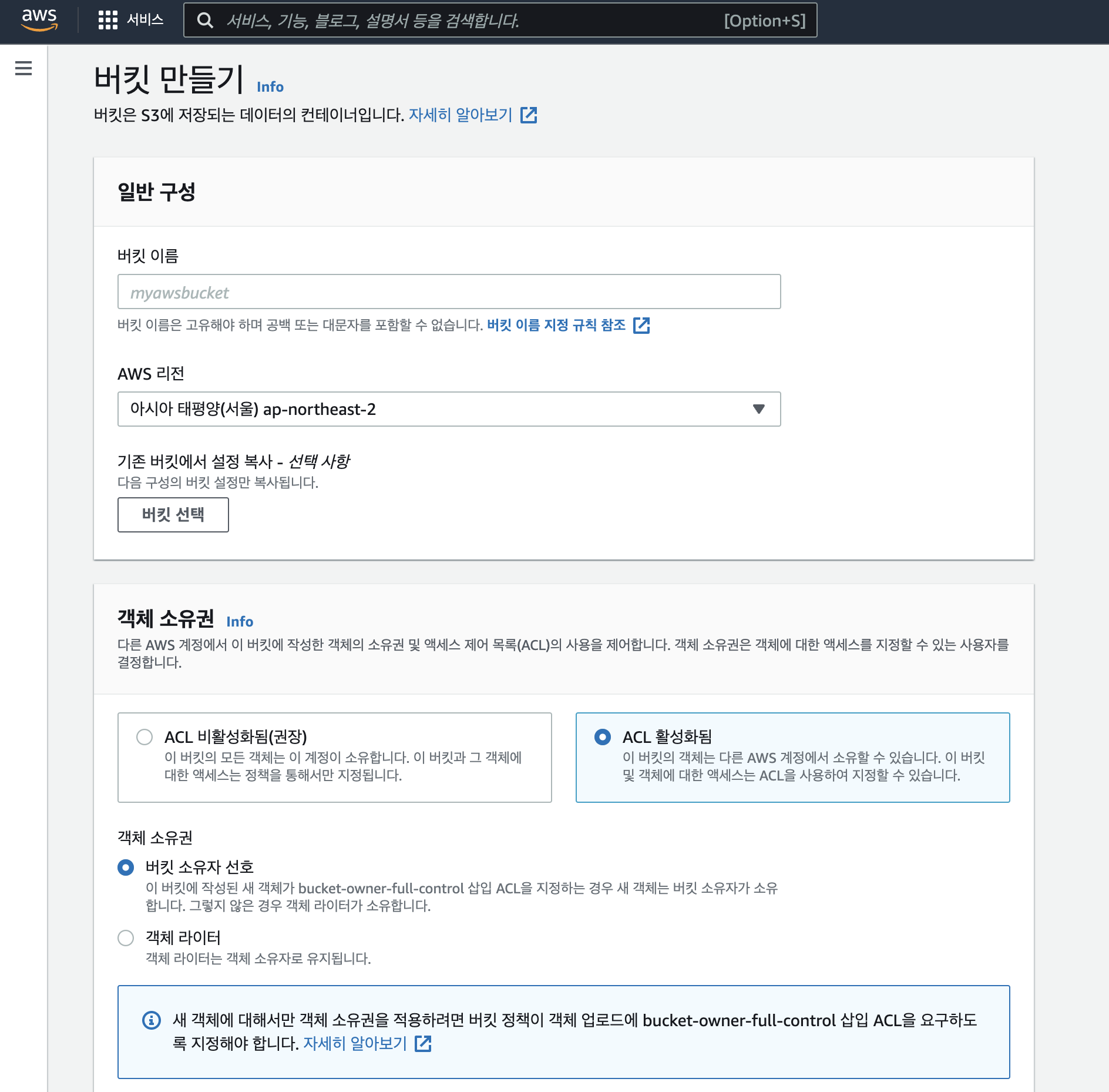 그리고 객체 소유권만 'ACL 활성화됨'으로 바꿔주시고, 나머지는 기본 설정대로 생성해주세요.