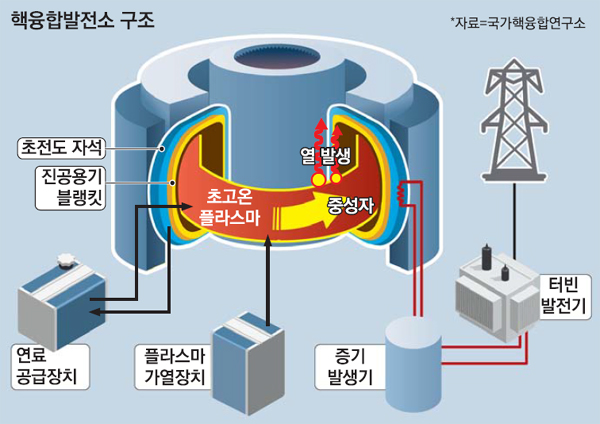 이와 달리, 핵융합 발전은 가벼운 원자핵들을 무거운 원자핵으로 융합시키는 과정에서 나오는 에너지를 이용하는 방식입니다. 바닷물 1L로 석유 300L와 맞먹는 에너지를 만들 수 있을 정도로 고효율을 자랑하며, 방사능 폐기물 걱정도 없는 기술이죠. 그러나 문제는 현재 기술로 구현하기 어렵다는 것인데요. 핵융합을 하려면 1억 도 이상의 온도를 유지하여, 원자핵과 전자가 분리된 플라스마 상태를 만들어줘야 합니다.