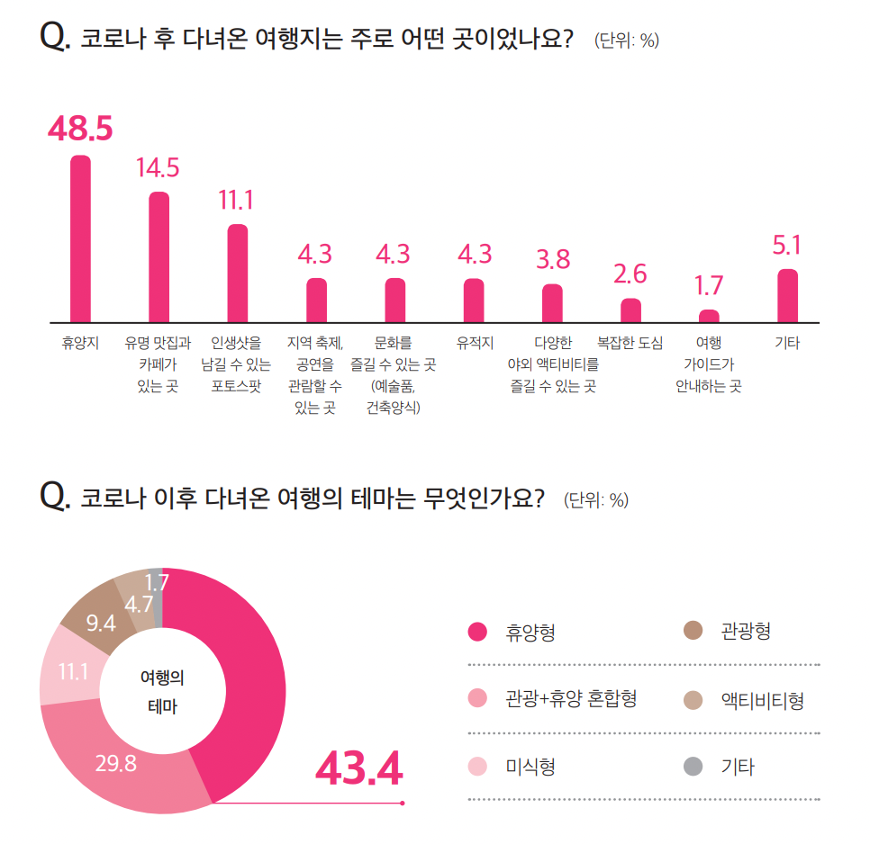 야놀자가 조사한 리포트에서도 휴양지 선호 현상을 확인할 수 있었습니다. 설문에 의하면 코로나 이후 여행을 다녀온 사람들의 약 절반 정도가 휴양지에 가거나 휴양을 테마로 여행을 다녀왔다고 응답했으며, 다른 사람들과 떨어져서 휴양을 즐길 수 있는 글램핑과 캠핑도 전년 대비 3배 이상 증가했다고 합니다.