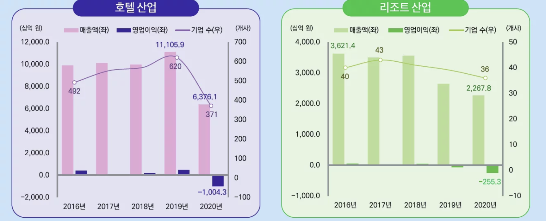 프리미엄 선호로 인해 호텔이 선방했다고 하더라도, 호텔 산업 역시 코로나의 타격을 피해가지는 못했습니다. 국내 호텔업계의 총매출액은 2019년까지 약 10조 원 규모로 안정적인 실적을 보여줬으나, 2020년에는 코로나로 인해 약 6조 원까지 급감했습니다. 영업이익 또한 마이너스로 돌아섰죠.