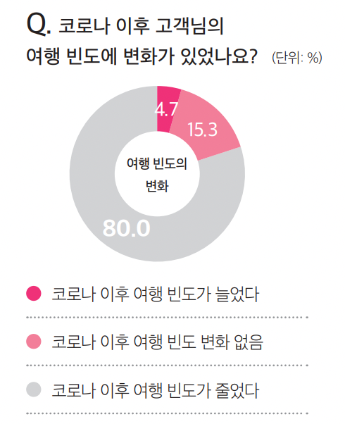 야놀자가 발간한 리포트에 따르면, 코로나 이전에는 사람들이 연평균 4~6회 정도 국내여행을 다녔던 반면 코로나 이후에는 이 수치가 1~4회로 감소했다고 합니다. 그리고 응답자의 80%는 코로나 이후 여행 빈도가 줄었다고 답했는데요. 실제로 코로나 전후 관심사를 조사해보았을 때, 64.2% 비중을 차지했던 여행이 19.2%로 크게 하락한 것을 확인할 수 있었습니다.
