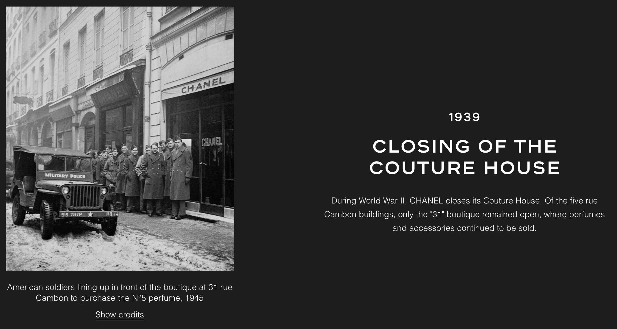 샤넬은 이후 액세서리 부문의 공장을 개설하고, 양장 전문점을 오픈하는 등 순탄하게 성장해왔습니다. 1939년에는 약 4천 명의 노동자가 일하는 기업이 되기도 했죠. 그러나 노동인권 부족에 대한 항의로 파업 투쟁이 벌어지고, 세계 2차 대전이 발발하며 샤넬은 향수랑 액세서리를 제외한 모든 매장의 문을 닫았습니다.