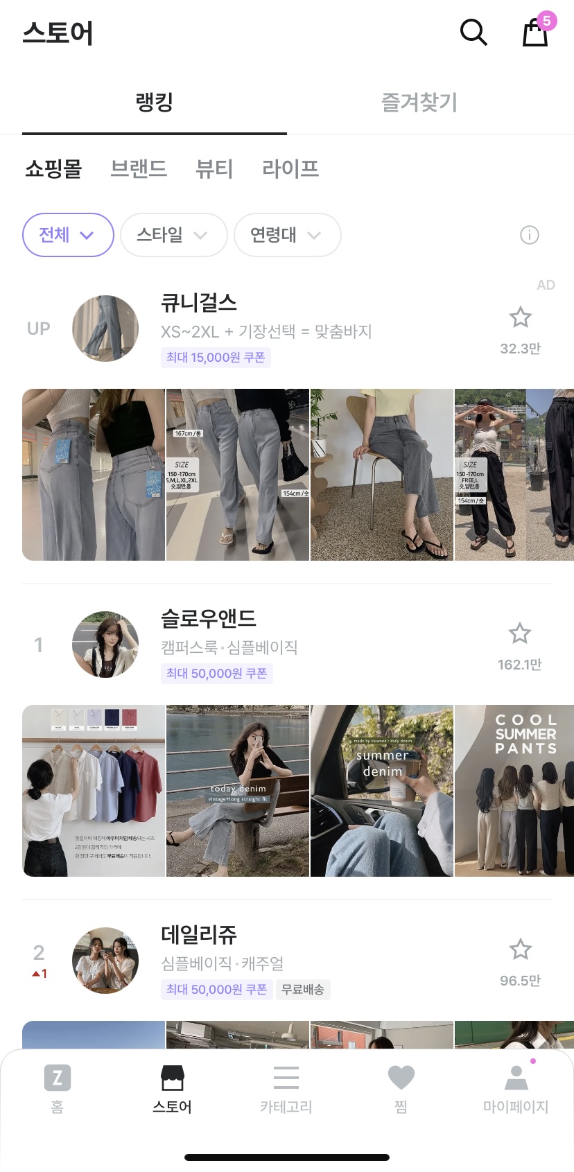 지금의 지그재그는 Z페이, 직진 배송으로 무장한 편리한 이커머스 플랫폼이자 브랜드 의류, 뷰티 및 라이프 상품 등 다양한 커버리지를 갖춘 올인원 커머스 플랫폼이 되어가고 있지만, 그래도 여전히 지그재그 앱에서는 그 뿌리가 드러나고 있습니다. 먼저, 지그재그, 에이블리, 무신사 세 앱의 하단 탭을 살펴보면 지그재그에만 [스토어]라는 탭이 존재한다는 것을 알 수 있습니다. 지그재그가 초창기에 각광받았던 이유는 (1) 쇼핑몰 랭킹을 통해 원하는 스토어를 금방 찾을 수 있게 해주고 (2) 그 스토어를 편하게 즐겨찾기해두고 다시 찾을 수 있다는 점이었다고 말씀드렸는데요, 그러다보니 현재의 앱에서도 [스토어] 탭의 ‘랭킹’과 ‘즐겨찾기’를 통해 스토어의 관계를 발견하고 정립할 수 있는 채널을 남겨둔 것입니다. 그리고 지그재그가 최근에 패션 플랫폼 최초로 ‘스토리’ 기능을 개발해 셀러가 팬들과 소통할 수 있도록 독려한 것도 그 시작점에 위치했던 ‘셀러와의 관계' 중심의 서비스 정체성을 이어가려는 움직임이라고 볼 수 있을 것입니다. 또한, 지그재그가 현상황에서는 브랜드, 뷰티, 라이프 등 다양한 상품군을 갖춘 커머스 플랫폼이 되었음에도 여전히 ‘소호 중심 쇼핑몰’로 각인되고 있는 것을 보면, 동대문 쇼핑몰 기반으로 시작했던 첫 발걸음이 계속해서 앱의 정체성을 규정짓고 있다는 사실을 확인할 수 있습니다.