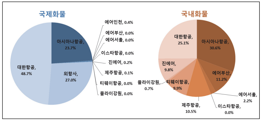세계 항공사 매출 순위에서 대한항공은 20위 권이고 아시아나 항공은 당연히 그 아래이다. 그러나 항공 화물 시장에서는 대한항공이 페덱스, 에미레이츠, 카타르 항공 등에 이어 6위, 아시아나항공이 20위권에 위치해 있다. 국내 대형항공사의 화물 수익 비중이 높았다는 것이다.