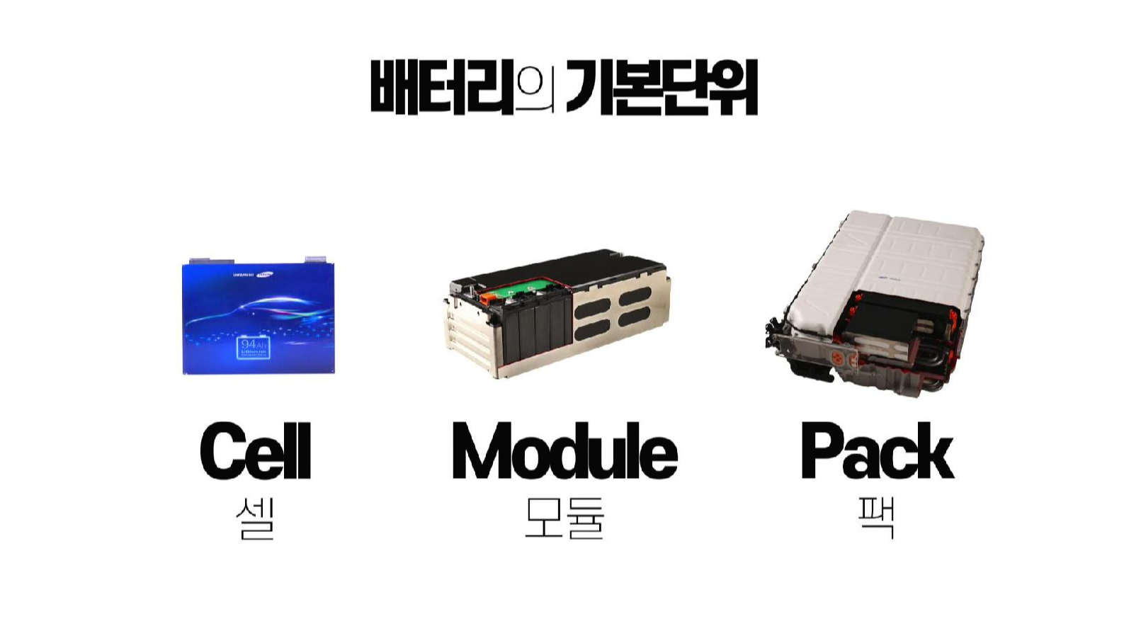 그렇다면 또 어디선가 자주 들어본 배터리 셀, 모듈, 팩은 어떤 것을 뜻하는 용어일까?