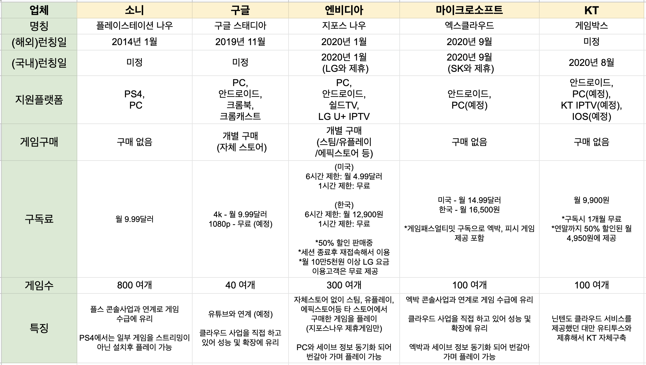 그래픽카드에 강점이 있는 엔비디아와, 클라우드 플랫폼을 운영하는 구글, 그리고 XBOX를 통해 게이밍 시장에서 경쟁력이 있는 마이크로소프트와 소니 등이 현재까지 클라우드 게이밍 산업에 진출해 있습니다.