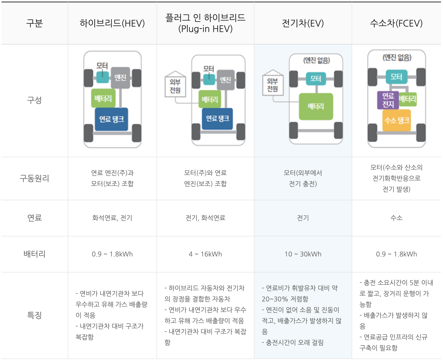 우선 친환경차라고 하면 보통 3, 4가지 종류를 뜻합니다. 바로 '하이브리드 자동차(HEV)', '플러그인 하이브리드 자동차(PHEV)', '전기 자동차(EV)', 그리고 '수소 자동차(FCEV)'입니다.