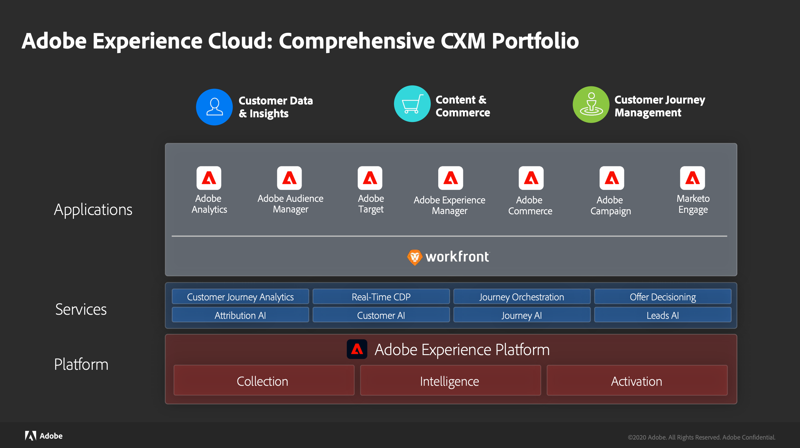 어도비에서는 디지털 익스피리언스 분야를 크게 '데이터와 인사이트(Data & Insight)', '콘텐츠와 커머스(Content & Commerce)', 그리고 '고객 관리 및 광고(Customer Journey Management and Advertising)'로 나누어 설명하고 있습니다. 아래의 이미지에서 알 수 있듯이, 어도비는 해당 분야에서 아주 다양한 서비스를 운영하고 있죠.