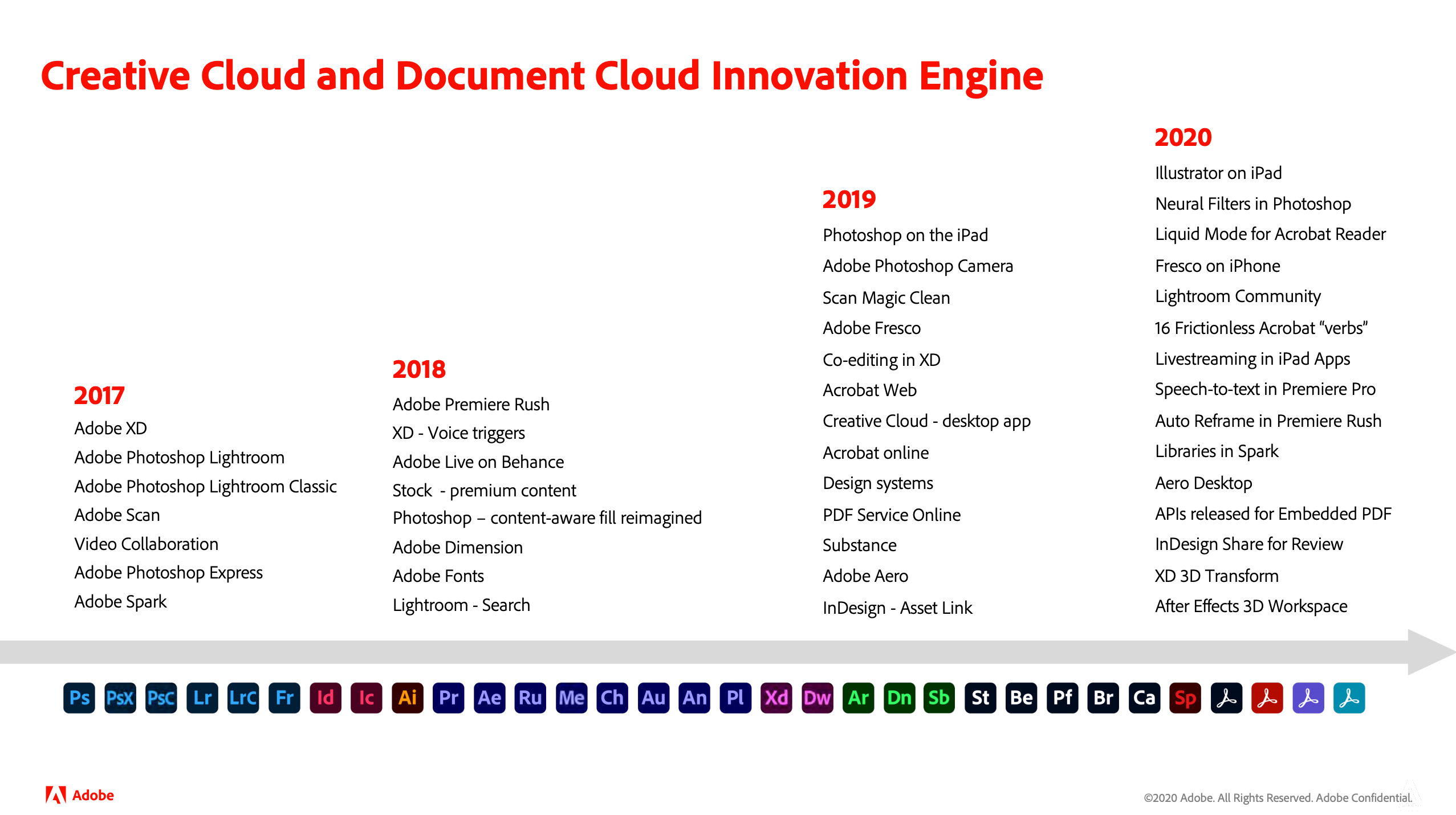 어도비의 미래 먹거리로 불리는 '디지털 익스피리언스' 분야는 디지털 비즈니스를 위해 필요한 종합적인 소프트웨어를 제공하는 부문으로 매출의 약 27%를 차지하고 있습니다. 2020년에는 전년대비 약 10% 성장하며 다른 부문대비 저조한 성장세를 보였는데요, 그래도 어도비에서는 '디지털 익스피리언스'를 차세대 산업으로 생각하며 노력을 기울이고 있습니다.
