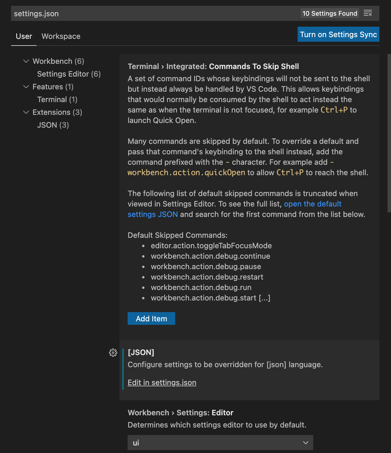 (2) settings.json 이라고 검색하고 "Edit in settings.json"을 클릭합니다.