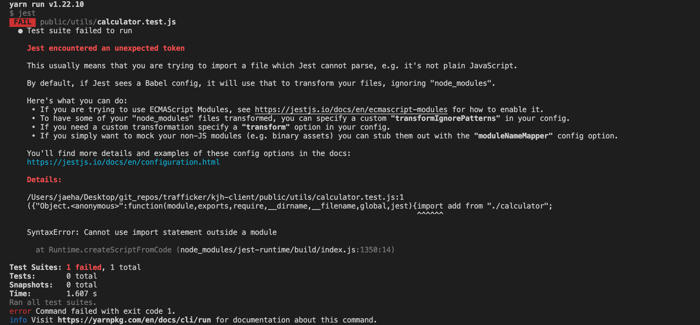 jest는 CommonJS 모듈 시스템을 사용하기 때문에 ES6 문법을 사용하면 에러가 나타납니다.