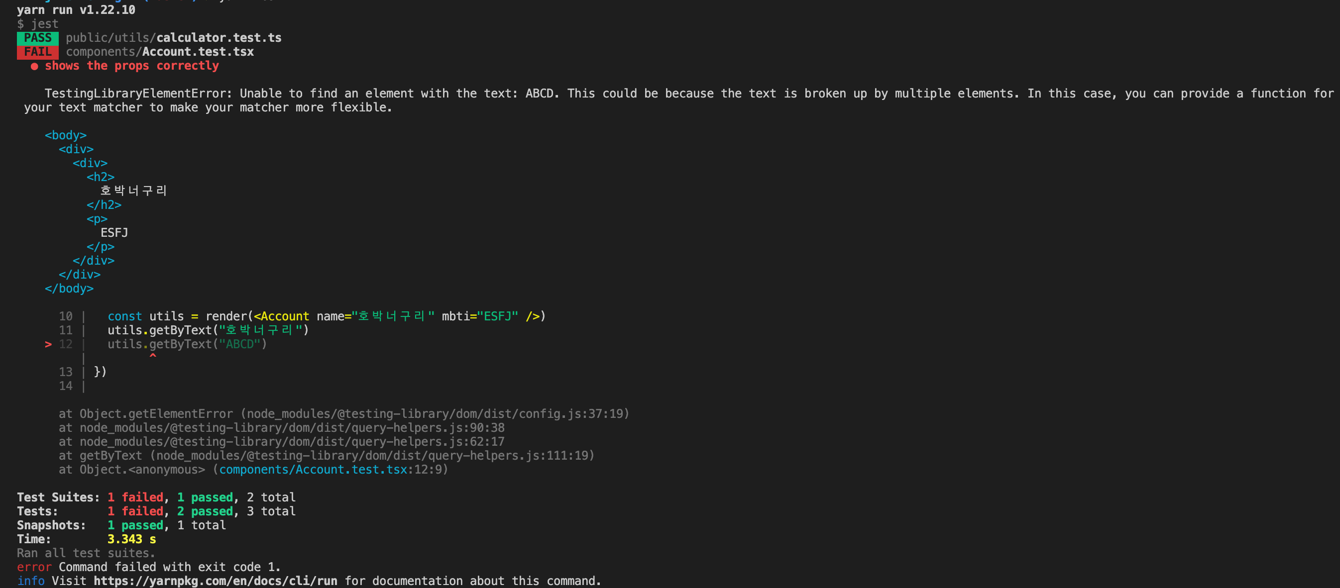 const utils = render(<Account name="호박너구리" mbti="ESFJ" />)