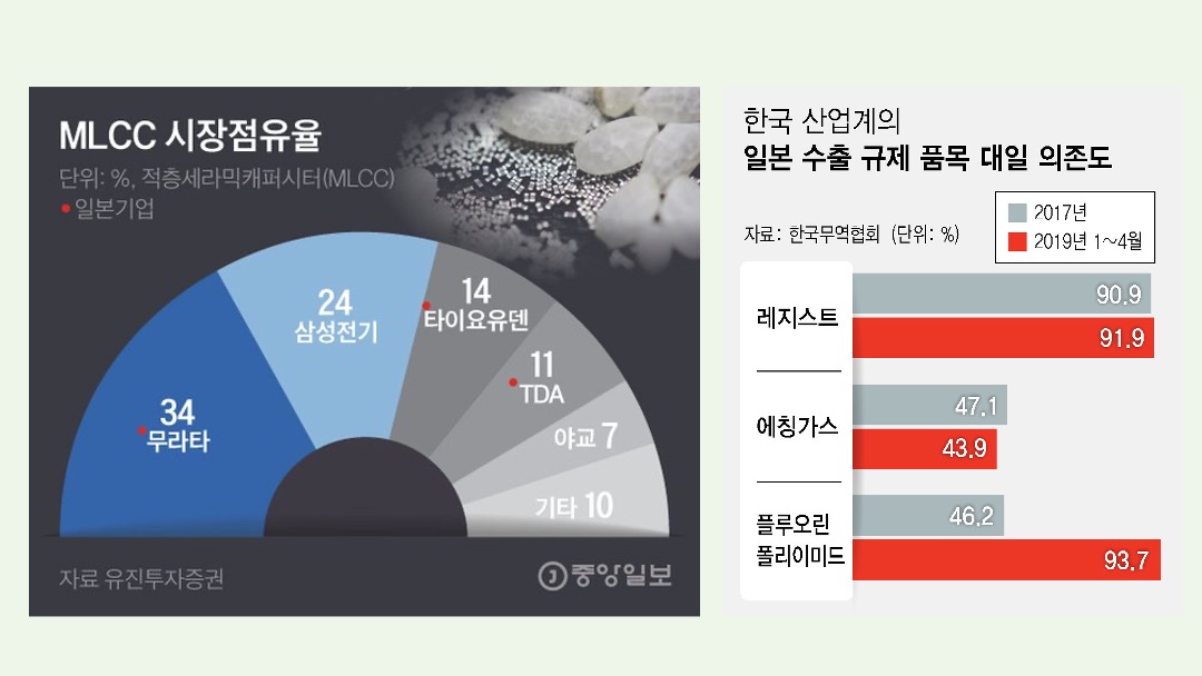우선 소재 분야에서 일본과 협력을 끊기는 거의 불가능할 정도로, 일본은 소재 분야에 강점을 갖고 있습니다. 일본의 수출규제 이슈 이후에 우리나라가 자급율을 높이기 위해 노력했음에도, 포토 공정에 사용되는 '포토레지스트'와 같은 몇몇 주요 소재 수입 비중은 여전히 약 90%에 달하기 때문입니다. 부품 분야에서도 전자산업의 쌀이라고 불리는 MLCC(적층 세라믹 캐퍼시터)는 삼성전기를 제외하고는 대부분 일본 기업이 시장을 차지하고 있습니다.