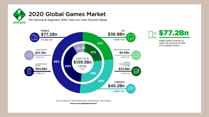 시장조사 업체 뉴주에 따르면 2020년 세계 게임 시장 규모는 1460억 달러(약 179조 650억 원) 규모라고 합니다. 특히 코로나 사태가 확산된 이후 많은 사람들이 모바일 게임을 즐기게 되면서, 글로벌 시장 역시 국내와 마찬가지로 모바일 게임 분야가 가장 크게 성장했습니다.