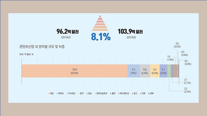 그러나 사실 국내 게임 산업은 과소평가된 분야 중 하나입니다. 게임 산업은 한 해에 약 7조 8000억 원의 수출액을 기록하는데, 해당 금액은 최근 들어 더욱 각광받는 음악산업(K-Pop) 수출액보다 10배 이상 크고, 국내 콘텐츠 산업 수출액의 약 70%에 해당하기 때문입니다.