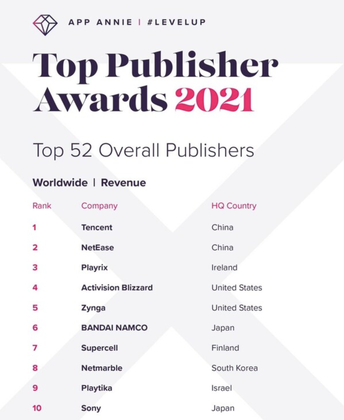 앱애니에 따르면 2020년 전 세계에서 가장 높은 매출을 올린 배급사는 텐센트(중국)였으며, 넷이즈(중국), 플레이릭스(아일랜드), 액티비전 블리자드(미국), 징가(미국)가 그 뒤를 이었습니다. 총 52위까지 발표됐는데, 순위에 포함된 국내 배급사로는 넷마블(8위), 엔씨소프트(18위), 게임빌(49위), 더블유게임즈(52위)가 있습니다.