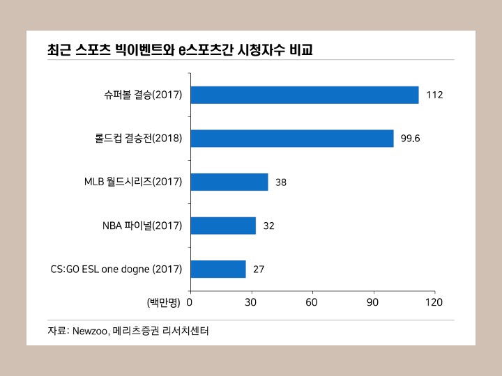 많은 인기와 시청자 수에도 불구하고 아직 e스포츠 시장은 1.1조 원 규모밖에 되지 않습니다. 이는 유럽 5대 축구리그 시장규모의 6% 수준에 불과한 것으로, 그만큼 e스포츠 산업은 발전 가능성이 큰 상황입니다. 앞으로 소규모 대회에서 '프랜차이즈형 리그'로 변화하고 스폰서쉽이 증가한다면, 시장의 규모는 빠른 속도로 증가할 것입니다.