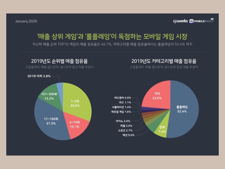 모바일 게임 매출의 성장에는 유명 PC게임의 IP(지적재산권)가 크게 기여했습니다. 2020년 매출 상위권을 차지한 '리니지2M'이나 '바람의 나라: 연'이 PC게임의 IP를 활용해서 성공한 대표적인 모바일 게임입니다. 그렇게 2013년 초반에는 팡류나 퍼즐류 등 캐주얼 게임이 인기였다면, 2016년 12월 '리니지2 레볼루션'을 시작으로 현재는 MMORPG가 모바일 시장의 주도권을 차지하고 있죠.
